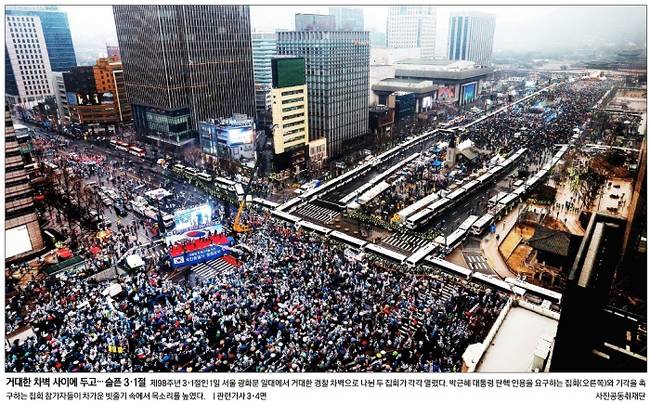 경향신문은 제98주년 3·1절인 1일 서울 광화문 일대에서 거대한 경찰 차벽으로 나뉜 두 집회가 각각 열린 모습을 1면 사진으로 전했다. 경향신문은 “오후 2시 세종로 사거리는 태극기와 성조기를 든 사람들로 붐볐다. 참가자들은 국회와 헌법재판소, 박영수 특별검사팀, 언론을 노골적으로 부정했다”며 “이날 오후 5시 퇴진행동이 주최하는 촛불집회가 시작될 무렵엔 비가 내리기 시작했다. 참가자들은 비옷을 입거나 우산을 쓰고 태극기에 세월호 참사를 상징하는 노란 리본을 단 채 ‘박근혜 퇴진 만세! 탄핵 인용 만세! 촛불시민 만세!’ 등을 외쳤다”고 보도했다.