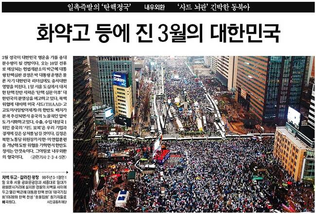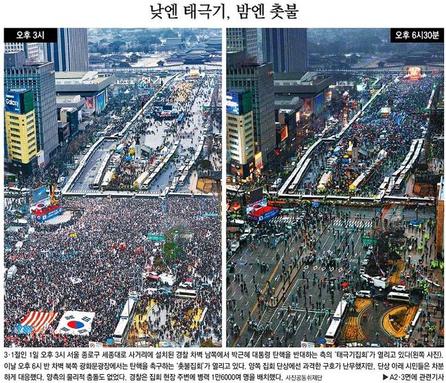박근혜 대통령 탄핵을 두고 찬성과 반대의 목소리가 1일 서울 광화문 일대에서 충돌했다. ‘대통령 탄핵 기각을 위한 국민총궐기 운동본부(탄기국)’는 1일 오후 2시부터 세종로사거리를 중심으로 남대문으로 향하는 태평로와 동대문으로 향하는 종로 방향으로 이어진 약 4.8km의 도로에서 15차 태극기집회를 열었고 ‘박근혜 정권 퇴진 비상국민행동(퇴진행동)’은 오후 5시부터 광화문광장에서 18차 촛불집회를 열었다. 이날 모든 신문들은 경찰 차벽을 사이에 두고 맞붙은 양쪽 집회의 모습을 1면 사진으로 실었다.