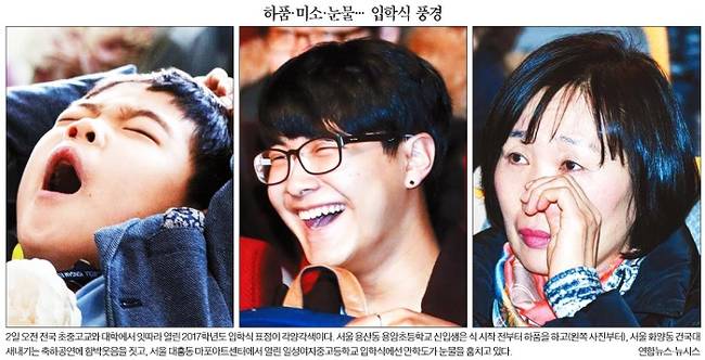 2일 전국 초중고교와 대학에서 잇따라 2017학년도 입학식이 열렸다. 이날 몇몇 신문들은 각양각색 입학식 모습을 1면 사진으로 실었다.