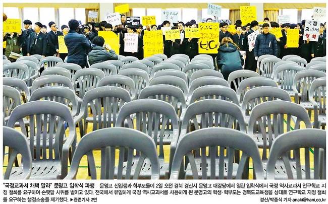 입학식에서 손팻말 시위가 벌어진 곳도 있었다. 한겨레는 문명고 신입생과 학부모들이 2일 경북 경산시 문명고 대강당에서 열린 입학식에서 국정 역사교과서 연구학교 지정 철회를 요구하며 손팻말 시위를 벌이고 있는 모습을 1면 사진으로 전했다.
