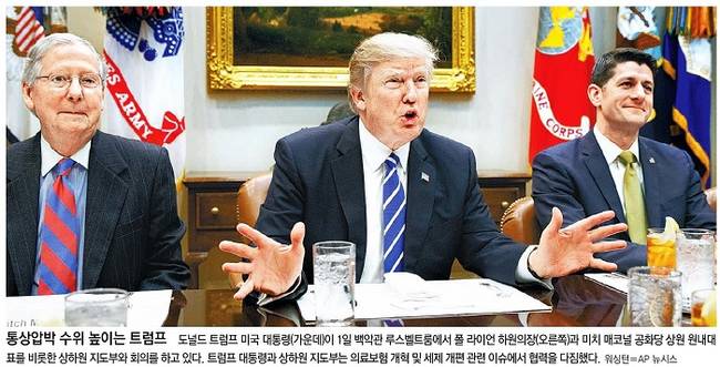 동아일보 세계일보 등은 트럼프를 주목했다. 동아일보는 도널드 트럼프 대통령이 1일 백악관 루스벨트룸에서 폴 라이언 하원의장과 미치 매코널 공화당 상원 원내대표를 비롯한 상하원 지도부와 회의를 하고 있는 모습을 1면 사진으로 전했다. 동아일보는 “트럼프 대통령과 상하원 지도부는 의료보험 개혁 및 세재 개편 관련 이슈에서 협력을 다짐했다”며 “또 교역을 계속하려면 ‘미국법’을 따라야 한다고 밝혔다. 앞으로 미국이 한국에 자유무역협정(FTA) 재협상을 요청하고 이에 응하지 않을 경우 징벌적인 관세를 매길 것으로 우려된다”고 보도했다.