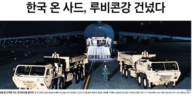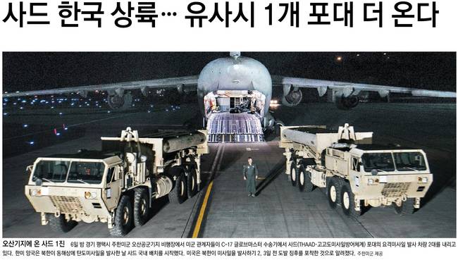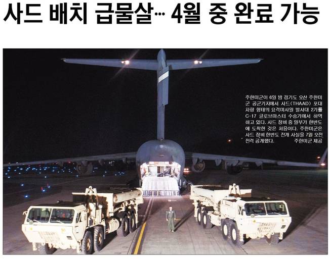 국민일보는 "한·미 양국이 사드 배치를 서두르는 것은 북한의 핵·미사일 위협이 빠르게 현실화되고 있는 안보적 이유다. 경제보복 조치 등 중국의 거센 반발에도 한·미 양국이 흔들리지 않는다는 점을 확실히 할 필요도 있었다"며 "중국은 사드 한반도 배치가 거론되자 철회를 요구해 왔고, 부지가 결정되자 노골적으로 경제적인 보복을 가하고 있다. 조만간 열릴 미·중 고위급 회담을 앞두고 사드 장비를 들여옴으로써 돌이킬 수 없는 상황임을 확실히 하겠다는 의지도 담겨 있다"고 전했다.