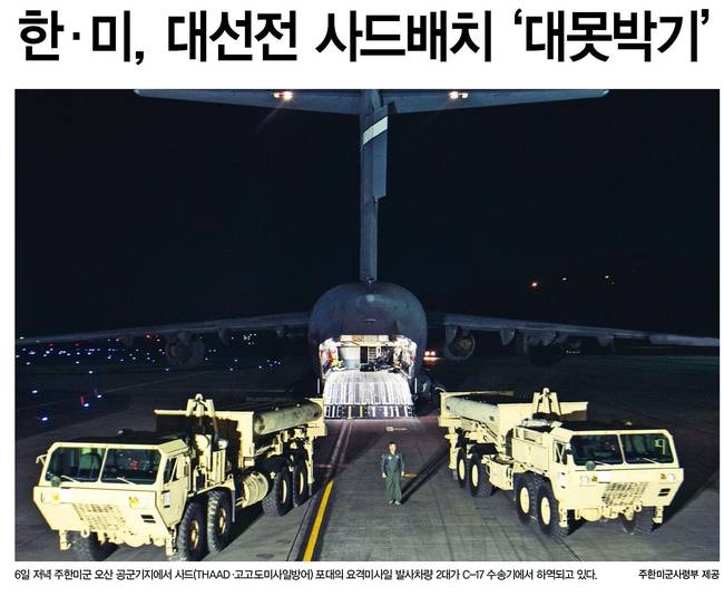 한국일보는 "한반도에 전개된 사드 발사체는 조기 대선의 불확실성을 키울 변수로 급부상할 가능성이 높아졌다. 헌법재판소의 탄핵 심판 이후 예상되는 보수층 결집과 맞물려 야권으로 기울어진 대선 판을 흔들 가능성도 배제할 수 없게 됐다"며 "최근 국내외 상황을 고려할 때 이런 설명을 곧이 곧대로 받아들이기는 어렵다. 탄핵 심판 결정을 앞두고 거세지는 사회적 혼란을 가중시킬 수 있다는 점이나 중국의 노골적인 보복으로 국내 경제 타격이 불가피하다는 전망 등을 고려하면 국내 정치 상황을 빼놓고 설명하기 힘들기 때문"이라고 보도했다.