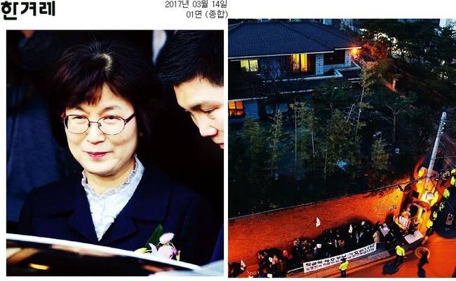 한겨레도 관련 소식을 전하며 “박근혜 전 대통령의 탄핵심판 재판장을 맡았던 이정미 헌법재판소장 권한 대행이 구내식당에서 재판관들과 마지막 점심식사를 한 뒤 차량에 올랐다”고 설명했다. 한겨레는 이날 두 번째 밤을 맞이한 삼성동의 모습도 1면으로 보도했다. 한겨레에 따르면 13일 저녁 박근혜 전 대통령 자택 주변은 경찰과 취재진, 박 전 대통령 지지자들로 붐볐다.