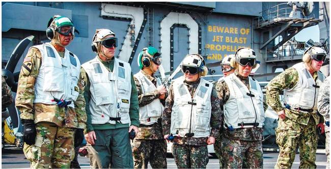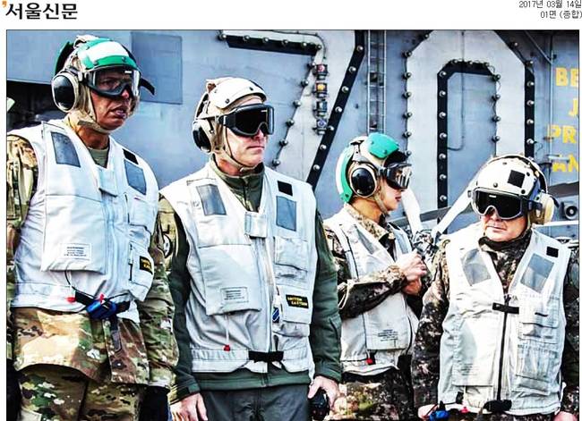 서울신문과 세계일보, 조선일보는 한미 연합훈련 소식을 1면 사진에 담았다. 서울은 “이순진 합참의장과 빈센트 브룩스 한미연합사령관이 지난 12일 한미 연합훈련인 독수리 훈련에 참가 중인 미국 핵추진 항공모함 칼빈슨호를 방문해 작전 현황을 점검했다”고 보도했다.