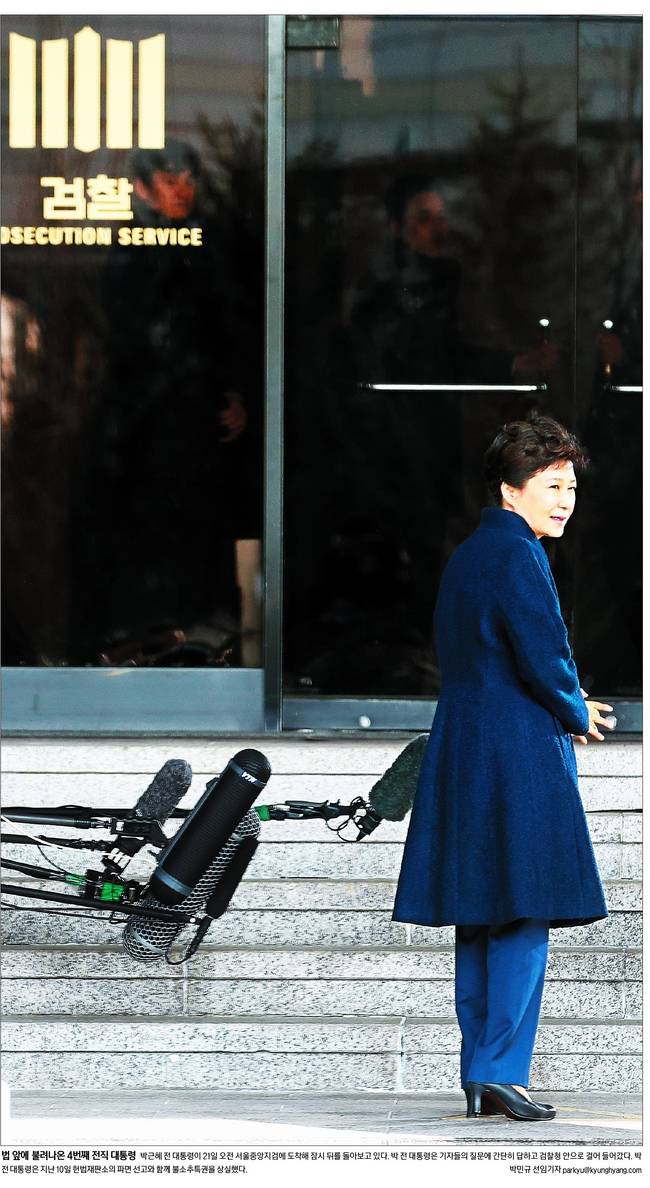 경향신문은 지난 21일 박 전 대통령이 서울중앙지검에 도착해 검찰청 안으로 들어서기 직전의 모습을 대문사진으로 선택했다. 경향은 관련기사에서 “대한민국 헌정 사상 처음으로 파면된 박근혜 전 대통령이 21일 뇌물수수 혐의 등으로 검찰에서 피의자 조사를 받았다. 이날 오전 9시 35분부터 14시간 가량 이어진 신문에서 박 전 대통령은 자신의 혐의를 대부분 부인하거나 민감한 사실관계에 대해서는 ‘일일이 기억이 나지 않는다’는 취지로 진술한 것으로 전해졌다. 삼성으로부터 뇌물수수 혐의는 전면 부인하고, 일부 증거가 명확한 부분에서는 사실관계를 인정하면서도 불법·위법 행위를 지시한 적은 없다고 주장했다”고 보도했다.
