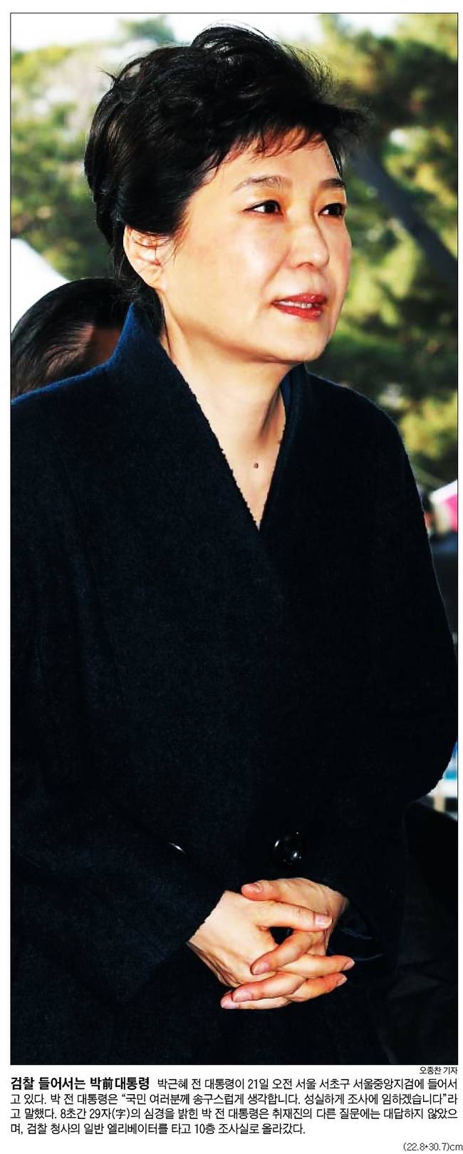 동아일보도 서울중앙지검 청사 앞에 선 박 전 대통령의 모습을 1면에 담았다. 동아는 관련기사에서 “박근혜 전 대통령이 21일 검찰에 소환되면서 대선주자들과 정치권은 대선판도에 미칠 영향에 촉각을 곤두세우고 있다. 박 전 대통령의 구속 수사 여부가 48일 앞으로 다가온 대선 정국을 흔들 수 있어서”라고 게재했다. 동아는 ”자유한국당은 제외한 각 당 대선 주자들은 이날 한목소리로 박 전 대통령에 대한 검찰의 엄정한 수사를 촉구했다. 하지만 대부분의 주자가 ‘구속 수사가 적절하냐’를 두고는 말을 아꼈다. 검찰 수사에 영향을 주지 않겠다는 이유에서다. 하지만 파면당한 박 전 대통령이 구속수사를 받으면 일부 보수층의 반발이 더욱 거세지는 등 역풍을 맞을 수 있다는 우려가 깔린 것으로 풀이된다“고 보도했다.