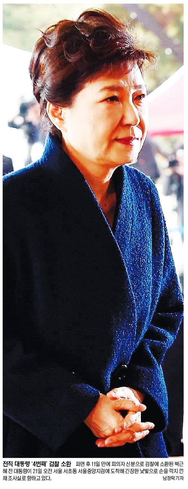 박근혜 전 대통령이 21일 433억원의 뇌물수수 혐의 등으로 14시간에 걸친 검찰조사를 받았다. 박 전 대통령은 혐의 대부분을 적극적으로 부인한 것으로 알려졌다. 검찰의 구속영장 청구여부에 관심이 쏠린다. 22일 모든 주요 일간지들은 피의자 신분으로 조사를 받기 위해 서울중앙지검으로 들어서는 박 전 대통령의 모습을 1면에 배치했다.
