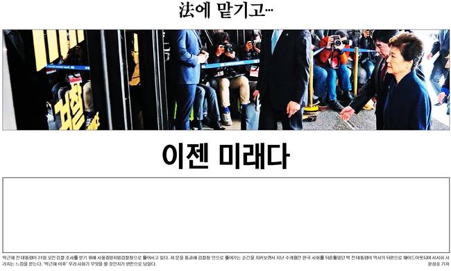 국민일보는 서울중앙지검에 들어서는 박 전 대통령의 모습과 ‘빈칸’을 위·아래로 1면에 배치했다. 국민은 사진설명에서 “저 문을 통과해 검찰청 안으로 들어가는 순간을 지켜보면서 지난 수개월간 한국사회를 뒤흔들었던 박 전 대통령이 역사의 뒤편으로 페이드아웃되며 서서히 사라지는 느낌을 받는다. ‘박근혜 이후’ 우리 사회가 무엇을 할 것인지가 빈칸으로 남았다”고 전했다.