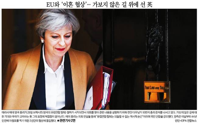주요 종합일간지들은 30일자 1면 사진기사로 영국의 EU 탈퇴를 위한 본격적인 협상이 시작됐다며 테리사 메이 영국 총리가 브렉시트를 공식 통보하는 서한에 서명하고 있는 장면을 실었다.