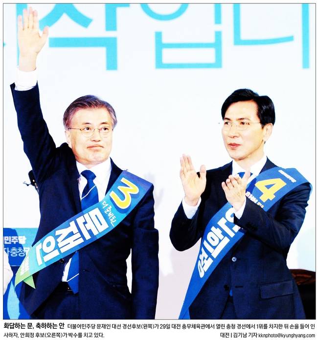 경향신문은 더불어민주당 문재인 대선 경선후보(왼쪽)가 지난 29일 대전 충무체육관에서 열린 충청 경선에서 1위를 차지한 뒤 손을 들어 인사하자, 안희정 후보(오른쪽)가 박수를 치고 있는 장면을 실었다.
