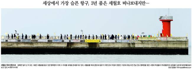 한겨레는 세월호를 목포신항으로 옮기기 위한 준비작업이 한창인 가운데 29일 오전 전남 진도 팽목항을 찾은 서원대 학생들이 추모펼침막과 상징물이 설치된 방파제를 둘러보고 있는 모습을 담았다.
