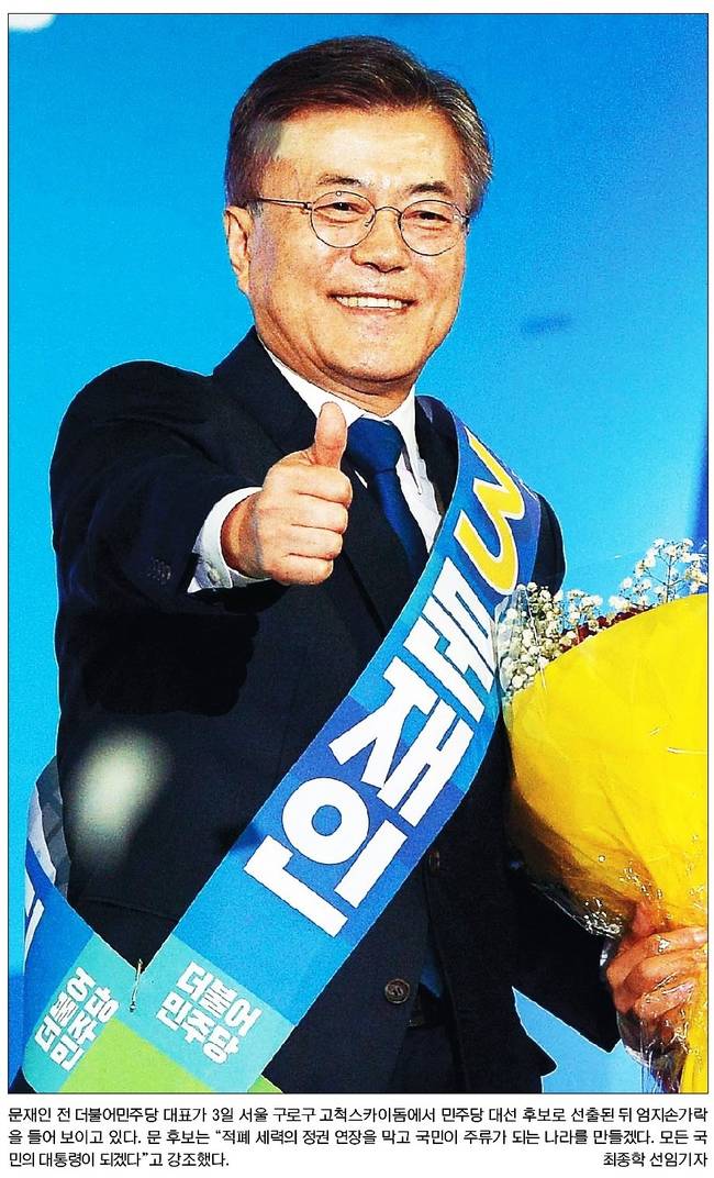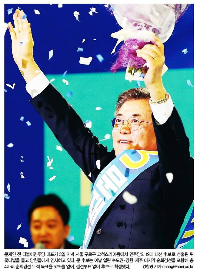 문재인 더불어민주당 전 대표가 3일 19대 민주당 대통령선거 후보로 확정됐다. 문 전 대표는 이날 열린 민주당 수도권·강원·제주 순회경선에서 60.4%를 획득해 경선 누적 득표율 57.0%를 기록하며 본선에 직행했다.