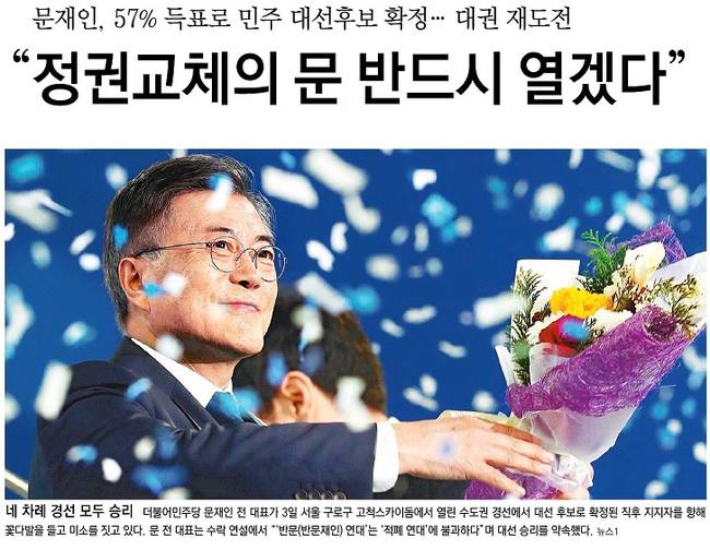 국민일보는 "문재인 전 더불어민주당 대표가 3일 수도권 순회경선에서 압승하며 대세론에 확실히 올라탔다. 하지만 민주당 대선 후보로서의 앞길에는 당내 통합과 안정감 입증, 경쟁상대의 집중공세 돌파라는 3가지 과제가 남아 있다"며 "세력과 정당이 다르지만 이번 대선판은 ‘문재인 대 반문재인’ 구도로 굳어지는 분위기다. 홍준표 자유한국당 후보와 안철수 전 대표 등은 벌써부터 ‘문재인 때리기’에 열을 올리고 있다"고 보도했다.