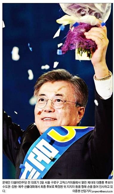 한겨레는 "경선 승리로 본선행을 확정지은 문 후보지만, 5월9일(대선)까지는 넘어야 할 고개가 여럿이다. 일단 그가 확장력을 보일 수 있느냐다. 그는 부동의 1위이긴 하지만 다자구도 지지율에서 3개월째 30%대에 묶여 있다"며 "그사이, 안철수 전 국민의당 대표는 최근 상승세를 타고 1년 만에 20%대 지지율 재진입을 노리고 있다. 안희정·이재명 두 사람에게 흩어졌던 표심을 문 후보 쪽으로 묶어낼 수 있는지도 변수"라고 보도했다.