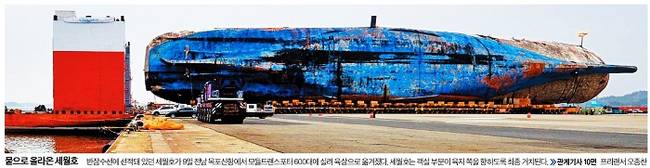 세계일보도 9일 세월호가 600대의 MT에 실려 반잠수식 선박에서 빠져나와 목포신항만 철재부두 육지로 옮겨지고 있는 모습을 1면 사진으로 전했다. 세계일보는 “해양수산부에 따르면 세월호의 육상이송 작업은 만조시간대에 맞춰 본격적으로 시작됐다. 이날 새벽 최종 테스트 결과 MT 600대가 세월호의 하중을 무리 없이 지지할 수 있다고 판단됨에 따라 오전 9시부터 오후 5시30분까지 MT를 이동시키는 작업이 진행됐다”며 “해수부는 이날 오후 세월호의 육상이송 작업을 완료했으며 받침대에 올려놓는 거치 작업은 10일 오전 시작하겠다고 밝혔다”고 보도했다.