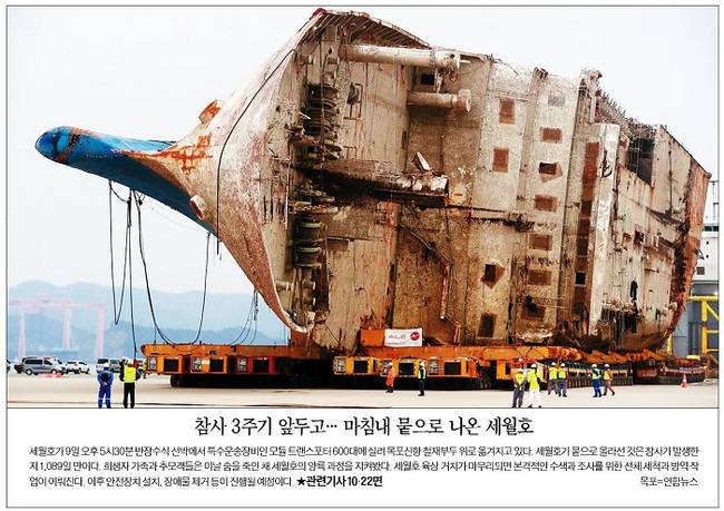 중앙일보도 뭍으로 올라온 세월호의 모습을 1면 사진으로 전했다. 중앙일보는 “해수부는 육상 거치가 완료되면 세척과 방역 작업을 한 뒤 미수습자 9명에 대한 본격적인 수색에 나선다. 애초 해수부가 검토하던 ‘객실 직립’ 수색 방식은 선체 훼손 우려 등으로 인해 유보된 상태”라며 “실제 수색에 나서는 인력은 20명 이상의 특수 해양경찰과 119소방 구급대원 등으로 구성된 수습팀이다. 해경과 국립과학수사연구원 직원들로 구성된 미수습자 신원 확인팀도 현장에서 대기 중"이라고 보도했다.