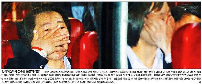북한 아이스하키 선수들을 조명한 신문도 있었다. 국민일보는 2017 국제아이스하키연맹(IIHF) 아이스하키 여자 세계선수권대회 디비전 2 그룹 A(4부리그)에 참가한 북한 선수들이 9일 오전 7일간 머물렀던 숙소인 강원도 강릉 안현동 라카이 샌드파인 리조트에서 버스에 올라 2018 평창동계올림픽조직위원회 관계자들로부터 마지막 인사를 받고 감정이 북받친 듯 눈물을 훔치고 있는 모습을 1면 사진으로 전했다.