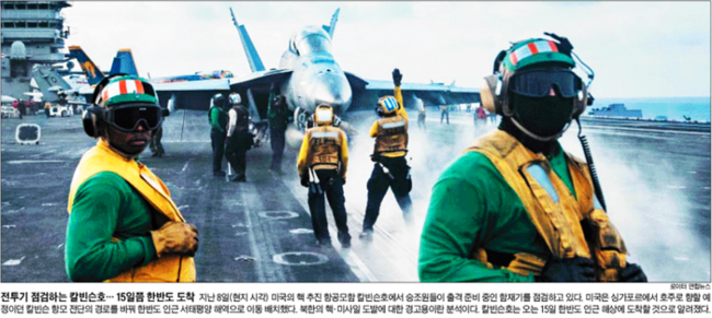 조선일보는 지난 8일 미국의 핵 추진 항공모함 칼빈슨호에서 승조원들이 출격 준비 중인 항재기를 점검하고 있는 모습을 1면 사진으로 전했다. 조선일보는 “도널드 트럼프 미 행정부가 북핵 문제 해결에 ‘모든 옵션을 검토하고 있다’고 밝힌 데 이어, 미 의회에서도 김정은 제거 이후 대책 마련이 필요하다는 주장이 제기됐다”며 “공화당 소속 코리 가드너 미 상원 외교위원회 동아시아·태평양 소위 위원장은 10일(현지시간) MSNBC방송 인터뷰에서 ‘김정은이 (제거돼) 없어진 뒤 누가 그 자리에 있을지 의문’이라며 ‘우리는 김정은 (제거) 이후에 무슨 일이 생길지 제대로 이해하지 못하고 있다. 한·미·일 동맹이 중국과 협력해 한반도 비핵화뿐 아니라 (김정은 제거) 이후에 무슨 일이 일어날지에 대한 계획도 세워야 한다’고 말했다”고 보도했다.