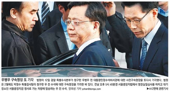 한편 우병우 전 대통령민정수석비서관에 주목한 신문도 있었다. 동아일보는 11일 오후 5시40분경 서울중앙지법에서 영장실질심사를 마치고 대기 장소인 서울중앙지검 청사로 가는 차량에 탑승하는 우 전 수석의 모습을 1면 사진으로 전했다. 동아일보는 “법원이 12일 검찰 특별수사본부가 청구한 우 전 수석에 대한 사전구속영장을 또다시 기각했다”며 “권순호 서울중앙지법 영장전담 부장판사는 12일 0시12분 ‘혐의 내용에 관해 범죄 성립을 다툴 여지가 있고 이미 진행된 수사와 수집된 증거에 비추어 증거인멸 및 도망의 염려가 있음이 충분하지 않아 구속의 사유와 필요성을 인정하기 어렵다’면서 우 전 수석의 구속영장을 기각했다”고 보도했다.