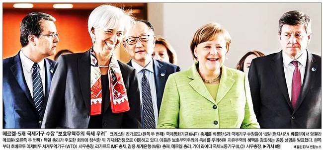 서울신문은 크린스틴 라가르드 국제통화기금(IMF) 총재를 비롯한 5개 국제기구 수장들이 10일(현지시간) 베를린에서 앙겔라 메르켈 독일 총리가 주도한 회의에 참석한 뒤 기자회견장으로 이동하고 있는 모습을 1면 사진으로 전했다. 서울신문은 “이들은 보호무역주의의 득세를 우려하며 자유무역의 혜택을 강조하는 공동 성명을 발표했다”며 “이례적인 이들의 성명은 트럼프 미국 대통령 당선 이후 보호무역주의가 강화되는 것을 우려한 선제적 대응으로 풀이된다. 이들은 ‘경제 성장을 위해 시장 개방과 자유무역이 필요하다’면서 ‘무역성장률 하락과 보호무역주의 위험 증가가 현재의 국제무역 시스템을 더욱더 지지하게 하고 있다’고 강조했다”고 보도했다.