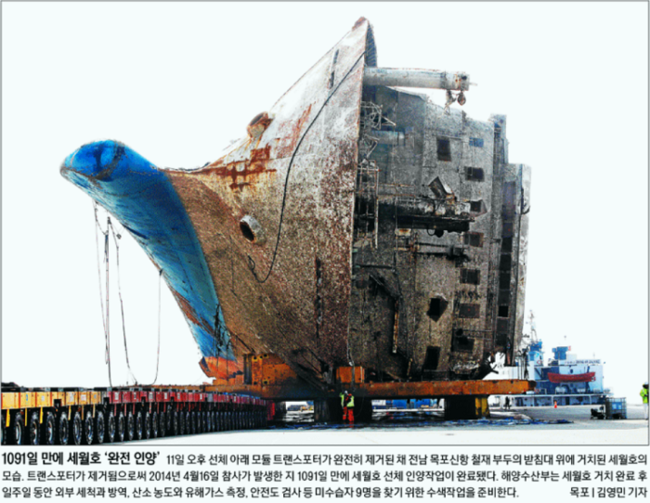 세월호 육상거치 작업이 11일 완료됐다. 경향신문은 11일 오후 선체 아래 모듈 트랜스포터가 완전히 제거된 채 전남 목포신항 철재 부두의 받침대 위에 거치된 세월호의 모습을 1면 사진으로 전했다. 경향신문은 “트랜스포터가 제거됨으로써 2014년 4월16일 참사가 발생한 지 1091일 만에 세월호 선체 인양작업이 완료됐다”며 “해양수산부는 세월호 거치 완료 후 일주일 동안 외부 세척과 방역, 산소 농도와 유해가스 측정, 안전도 검사 등 미수습자 9명을 찾기 위한 수색작업을 준비한다”고 보도했다.