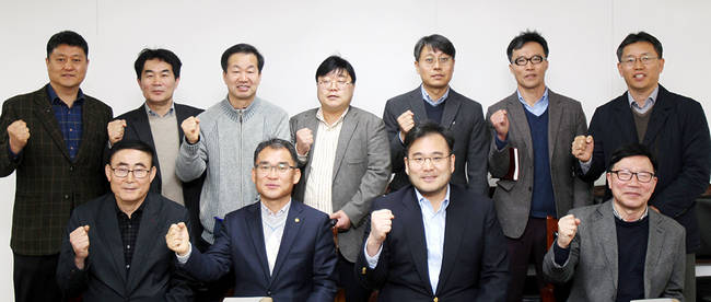 ▲전남일보 공프로젝트를 기획한 이재욱 전남일보 대표(앞줄 왼쪽 세 번째)와 이용규 편집국장(앞줄 왼쪽 두 번째) 등 공프로젝트 팀원들이 기획회의 후 파이팅을 외치고 있다. (전남일보)