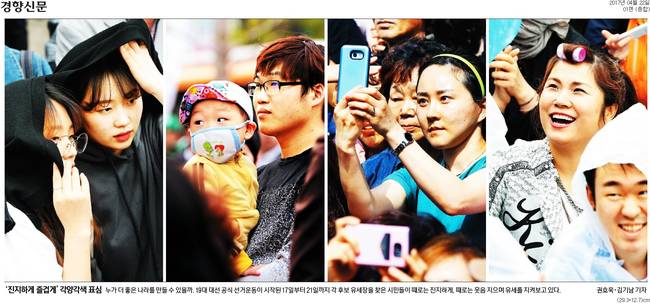 경향은 유세 현장에서의 시민들의 모습을 담으며 여론 조사 내용을 상세하게 전했다. 경향에 따르면 한국갤럽이 21일 발표한 대선후보지지도 조사에서 더불어민주당 문재인 후보가 국민의당 안철수 후보보다 오차범위를 넘어 앞서는 것으로 나타났다.