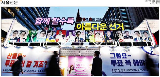 경향신문과 국민일보, 동아일보, 서울신문, 세계일보, 조선일보 등 22일 대다수 조간신문은 19대 대통령 선거가 코앞으로 다가오면서 관련 이슈를 1면 사진으로 보도했다.