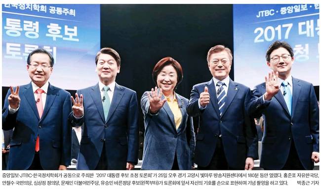 중앙일보는 토론에 앞서 이들 다섯 후보가 기념촬영을 하는 모습을 1면에 담았다. 중앙은 관련기사에서 “TV토론회에서 문재인 더불어민주당 후보와 보수 후보들이 정면으로 충돌했다”며 “지난 세 차례 TV토론이 인물대결 구도였다면 이날 토론은 이념 구도가 부각됐다”고 총평했다.