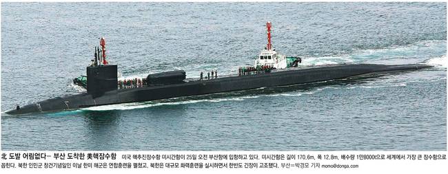 동아일보는 미국 핵추진잠수함 미시간함이 25일 부산항에 입항한 모습을 전면에 배치했다. 동아는 사진설명에서 “북한 인민군 창건기념일인 이날 한미 해군은 연합훈련을 펼쳤고, 북한은 대규모 화력훈련을 실시하면서 한반도 긴장이 고조됐다”고 전했다.