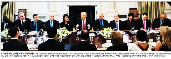 조선일보는 도널드 트럼프 미국 대통령이 24일 유엔 안전보장이사회의 15개 이사국 대사들을 백악관으로 초청해 오찬을 하는 모습을 전면에 배치했다. 조선은 관련기사에서 트럼프 대통령이 “북핵은 세계의 큰 문제”라며 “우리가 결국 해결해야 한다”고 말했다고 전했다. 또 “북한은 실질적인 위협으로 현상유지는 용납할 수 없다”며 “유엔 안보리는 북한 핵·미사일 프로그램에 대해 더 강력한 제재를 가할 준비를 해야한다”고 했다고 게재했다. 이어 조선은 “미국 대통령이 안보리 이사국 대사들을 모두 불러 북핵 위협과 해법을 강조한 것은 전례가 없다”고 부연했다.
