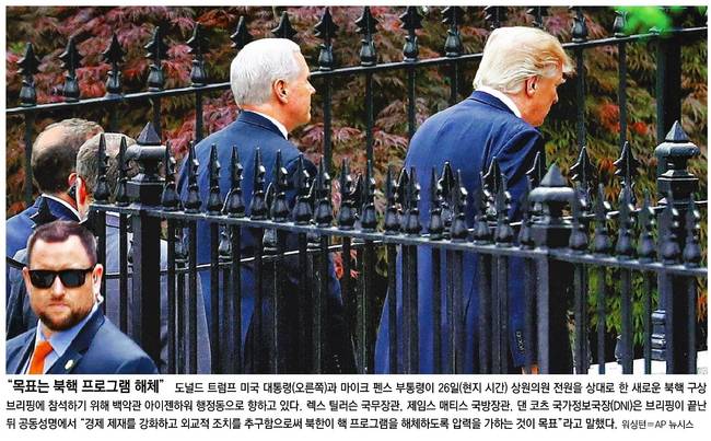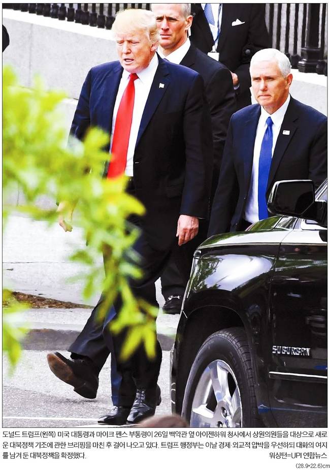 한국일보는 도널드 트럼프 미국 대통령과 마이크 펜스 부통령이 26일 백악관 옆 아이젠하워 청사에서 상원의원들을 대상으로 새로운 대북정책 기조에 관한 브리핑을 마친 후 걸어나오는 모습을 1면에 담았다. 한국은 관련기사에서 “미국의 외교·국방·안보분야 수장들은 ‘트럼프 대통령의 (대북) 접근은 경제제재를 강화하고, 동맹국 및 지역 파트너들과 협력해 외교적 수단으로 북한 핵·미사일 위협을 제거하는데 목표가 있다’고 밝혔다”며 “또 ‘한반도의 안정과 평화로운 비핵화를 추구하며, 그 목표를 이루기 위해 협상의 문을 열어두고 있다’고 강조했다”고 전했다. 한국은 이에 대해 “트럼프 대통령이 직접 나서 내놓은 그동안의 많은 호전적 수사들을 감안하면, 예상에 못 미치는 ‘저강도 대책’”이라면서도 “현재 추세라면 북한이 3,4년 안에 미국이 ‘레드라인(금지선)’으로 설정한 대륙간 탄도 미사일(ICBM) 실전 배치를 현실화할 것으로 예상되는 만큼, 이번 정책은 시한이 2~3년에 불과한 미국의 마지막 ‘비군사 압박정책’이라는 의미를 갖는다”고 게재했다.