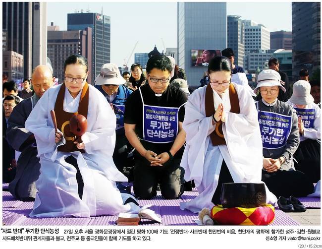 한겨레신문은 27일 서울 광화문 광장에서 열린 평화 100배 기도 ‘전쟁반대·사드반대 천만번의 비움, 천만개의 평화’에 참가한 종교인 등이 기도를 하는 모습을 1면에 담았다. 한겨레는 관련기사에서 “기습적인 사드 체계 배치에 이어 27일 국방부와 주한미군이 곧 ‘실제 운용’에 들어가겠다고 밝히면서, 사드를 둘러싼 공방이 거세지고 있다”며 “대선이 불과 12일 남은 상황에서 김(관진) 실장이 차기 정부의 외교안보 정책에 질적 변화를 강제하고 새대통령의 선택을 봉쇄하는 쪽으로 핵심 안보현안을 확정짓는 것은 권한을 넘어서는 행위라는 비판이 일고 있다”고 지적했다. 그러면서 “파면된 박근혜 전 대통령을 보좌하던 참모가 단순히 안보상황을 유지·관리하는 수준을 넘어 사실상 ‘결정자 행세’를 하고 있기 때문”이라고 덧붙였다.