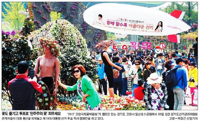 경향신문은 1일 1면 사진기사로 경기도선거관리위원회 관계자들이 30일 경기 고양시 국제꽃박람회가 열린 호수공원에서 관람객들에게 장미꽃 저금통을 나눠주며 대선 투표 캠페인을 펼치고 있는 모습을 담았다.