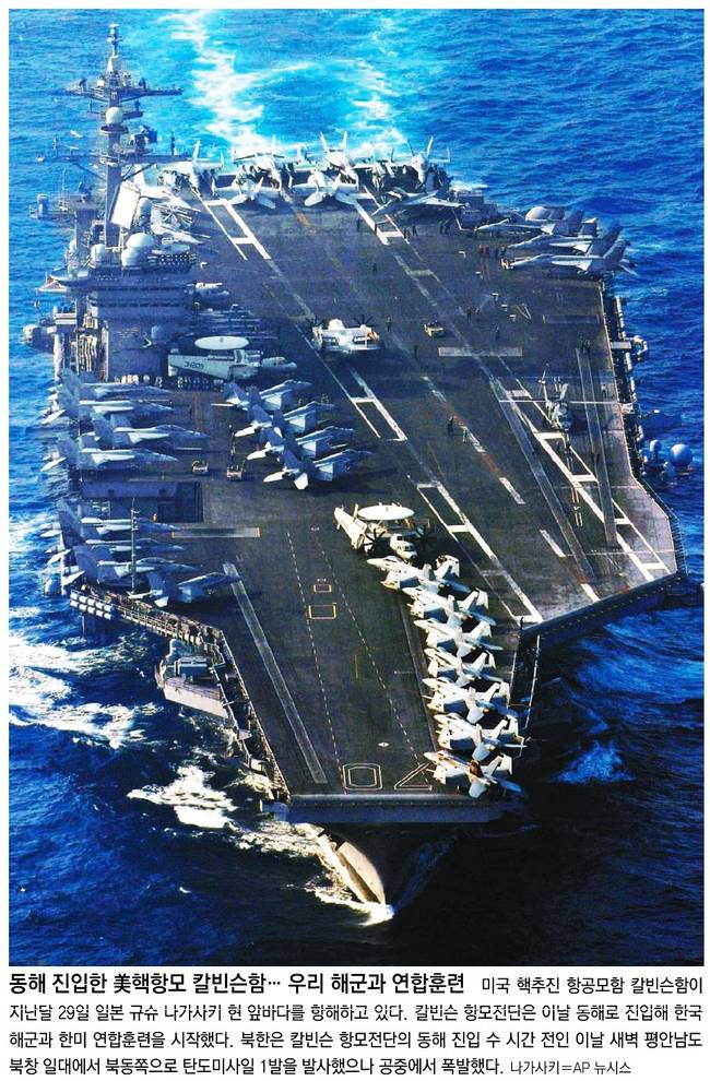 동아일보는 미국 핵추진 항공모함 칼빈슨함이 지난달 29일 일본 규슈 나가사키 현 앞바다를 항해하고 있는 모습을 담았다.