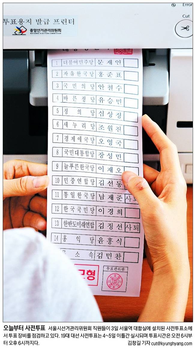경향신문은 서울시선거관리위원회 직원들이 3일 서울역 대합실에 설치된 사전투표소에서 투표 장비를 점검하고 있는 모습을 담았다. 19대 대선 사전투표는 4~5일 이틀간 실시되며 투표시간은 오전 6시부터 오후 6시까지다.