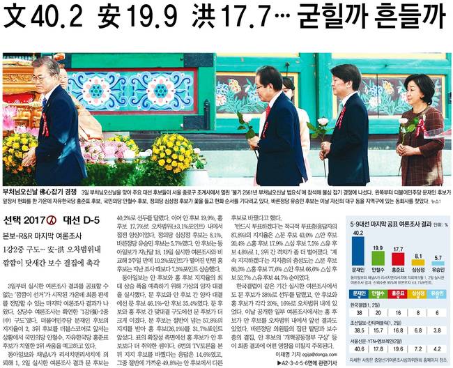 동아일보, 조선일보는 3일 부처님 오신날을 맞아 주요 대선 후보들이 서울 종로구 조계사에서 열린 '불기 2561년 부처님오신날 법요식'에 참석해 불심 잡기 경쟁에 나선 모습을 소개했다.