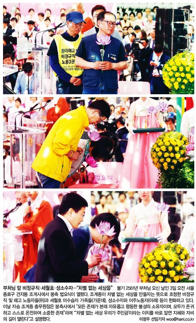 한겨레는 불기 2561년 부처님 오신 날인 3일 오전 서울 종로구 견지동 조계사에서 봉축 법요식이 열린 가운데 비정규 및 해고 노동자들(위)과 세월호 미수습자 가족들(가운데), 성소수자와 이주노동자(아래) 등이 헌화하는 모습을 담았다.