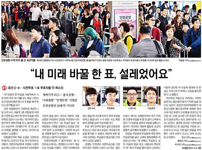 주요 신문들은 5일자 1면 사진기사로 19대 대통령 선거 사전투표가 시작된 4일 인천국제공항 출국장에 마련된 사전투표장에 출국 전 투표를 하려는 유권자들이 줄 서 있는 장면을 담았다.