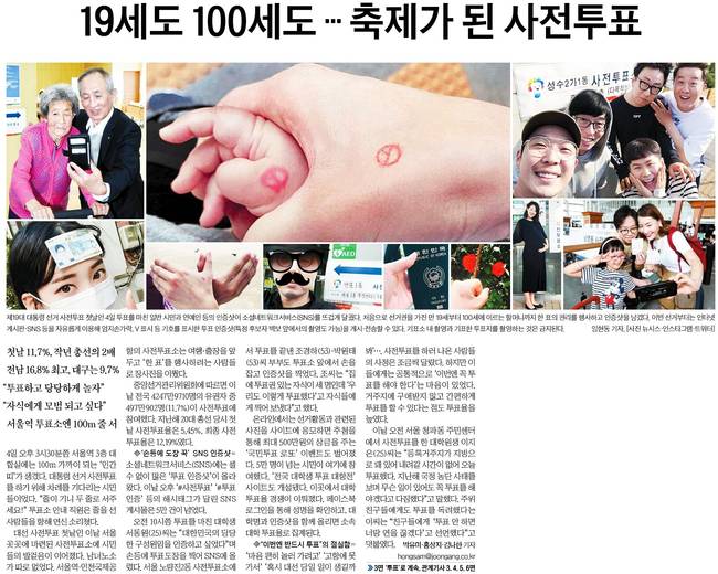 중앙일보는 제19대 대통령 선거 사전투표 첫날인 4일 투표를 마친 일반시민과 연예인 등의 인증샷이 소셜네트워크서비스(SNS)를 뜨겁게 달궜다며 처음으로 선거권을 가진 만 19세부터 100세에 이르는 할머니까지 한 표의 권리를 행사하고 인증샷을 남긴 모습을 담았다.