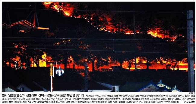 황금연휴 막바지인 6, 7일 강원 강릉, 삼척과 경북 상주, 영덕 등 전국 곳곳에서 대형 산불이 일어나 막대한 피해가 발생했다. 7일 산림청에 따르면 이틀간 전국에 20건의 산불이 발생해 약 170ha 규모의 산림이 사라졌다. 이날 모든 신문들은 산불 현장을 1면 사진에 담았다.