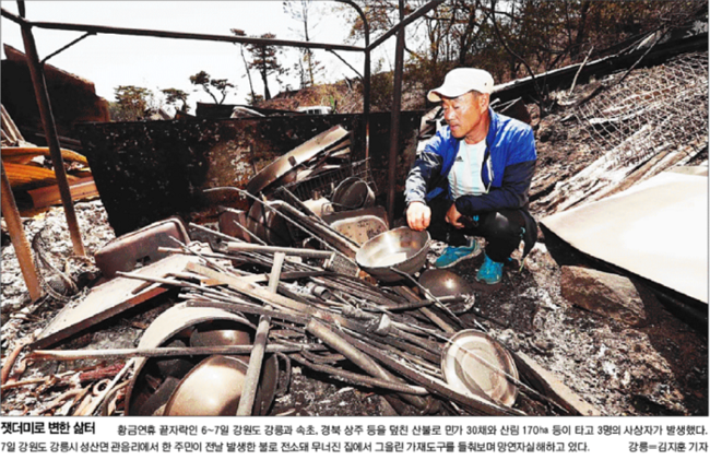 국민일보는 7일 강원도 강릉시 성산면 관음리에서 한 주민이 전날 발생한 불로 전소돼 무너진 집에서 그을린 가재도구를 들춰보며 망연자실해하고 있는 모습을 1면 사진으로 전했다. 국민일보는 “건조한 날씨가 이어지면서 전국 산과 들이 화약고처럼 변하고 있다”며 “지난 주말 발생한 산불 19건은 건조한 대기에 초속 15~20m의 강풍을 타고 걷잡을 수 없이 번졌다. 봄이 되면 양양과 간성 사이에서 부는 강한 바람인 양간지풍도 불길을 키웠다”고 보도했다.