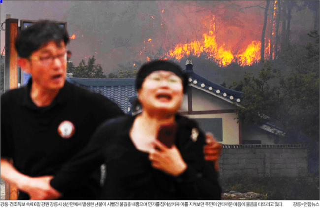 한국일보는 강풍·건조특보 속에 6일 강원 강릉시 성산면에서 발생한 산불이 시뻘건 불길을 내뿜으며 민가를 집어삼키자 이를 지켜보던 주민이 안타까운 마음에 울음을 터뜨리고 있는 모습을 1면 사진으로 전했다. 한국일보는 “황금연휴 막바지인 6, 7일 강원 강릉 삼척 경북 상주 등 전국 곳곳에서 큰 산불이 잇따랐지만 국가 재난 시스템은 제대로 작동하지 않았다”며 “긴급 대피령이 떨어지고 고속도로와 도심 아파트가 자욱한 연기로 뒤덮일 때까지 주민들한테는 재난문자 한 통 오지 않았다. 국가 재난 컨트롤타워인 국민안전처는 강원 강릉·삼척 산불이 강풍에 급속도로 번지는 상황에서도 긴급 재난문자를 발송하지 않았다”고 보도했다.