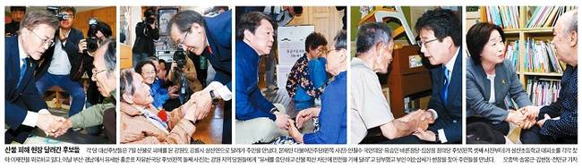 중앙일보와 한겨레는 각 당 대선후보들의 모습에 주목했다. 중앙일보는 7일 산불로 피해를 본 강원 강릉시 성산면으로 후보들이 달려가 주민을 만나는 모습을 1면 사진으로 전했다. 중앙일보는 “문재인 더불어민주당·안철수 국민의당·유승민 바른정당·심상정 정의당 후보가 성산초등학교 대피소를 각각 찾아 이재민을 위로했다”며 “이날 부산·경남에서 유세한 홍준표 자유한국당 후보는 강원 지역 당원들에게 ‘유세를 중단하고 산불 확산 차단에 만전을 기해 달라’고 당부했고 부인 이순삼씨가 현장을 찾아 주민들을 만났다”고 보도했다.
