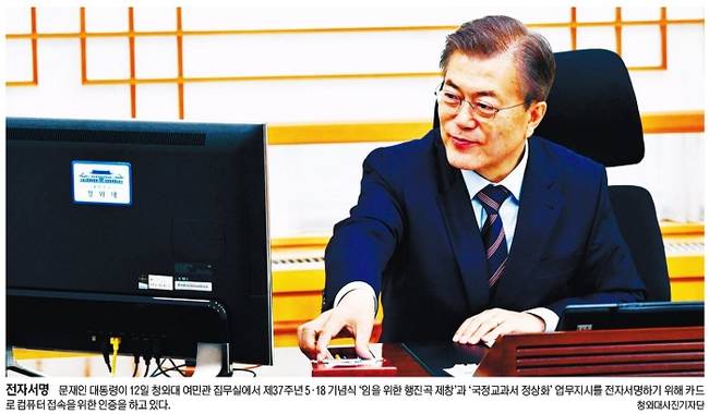 세계일보는 문 대통령이 12일 청와대 여민관 집무실에서 제37주년 5·18 기념식 ‘임을 위한 행진곡 제창’과 ‘국정교과서 정상화’ 업무지시를 전자서명하기 위해 카드로 컴퓨터 접속을 위한 인증을 하고 있는 모습을 1면 사진으로 전했다. 세계일보는 “문 대통령이 취임 사흘째인 이날 대선 기간 대표적 ‘적폐청산’ 과제로 지적했던 두 사안을 지시한 것은 본격적인 ‘문재인표 역사 바로세우기’라는 분석이 나온다”며 “문 대통령은 국정 역사교과서 폐지 후속조치로 2018년부터 적용 예정인 국·검정 교과서 혼용 체제를 검정체제로 전환할 것을 교육부에 지시했다. 이로써 2015년 10월 국정화 확정고시 발표 이후 1년6개월간 수십억원의 예산이 소요되고 사회적 갈등을 빚은 국정 역사교과서가 교육 현장에서 사라지게 됐다”고 보도했다.