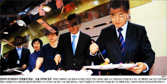조선일보는 문 대통령이 12일 청와대 비서동인 여민관 직원 식당에서 줄을 서서 식판에 반찬을 담고 있는 모습을 1면 사진으로 전했다. 조선일보는 “문 대통령은 12일부터 일상 업무를 청와대 본관 집무실이 아니라 비서동에 마련된 대통령 집무실에서 보기로 했다고 청와대 윤영찬 국민소통수석이 이날 밝혔다”며 “대통령이 집권하자마자 ‘주 집무실’을 비서동으로 옮긴 것은 이번이 처음이다. 역대 대통령들은 주로 비서동에서 500m 가량 떨어진 본관 집무실을 이용했다. 이 때문에 참모들과 소통에 문제가 생길 수밖에 없는 구조라는 지적이 있었다”고 보도했다.
