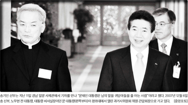 한편 중앙일보는 노무현 전 대통령과 문 대통령이 ‘정신적 지주’라 부른 송기인 신부의 인터뷰를 실으며 2007년 12월6일 송 신부, 노 전 대통령, 당시 대통령 비서실장이던 문 대통령이 청와대에서 열린 과거사위원회 위원 간담회장으로 가고 있는 모습을 1면 사진으로 전했다. 중앙일보는 “송기인 신부는 지난 11일 경남 밀양 사제관에서 기자를 만나 ‘문재인 대통령은 남의 말을 귀담아들을 줄 아는 사람’이라고 했다”며 “‘쭉 지켜본 문재인은 원래 권력 욕심이 없는 사람이다. 내가 계속 정치하라고 했는데 속으로 좀 미안했다. 그런데 ‘박근혜가 정치를 너무 못해서 저라도 할랍니다’며 갑자기 한다더라고’ 말했다”고 보도했다.