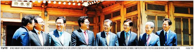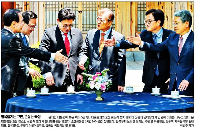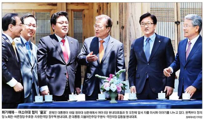 문재인 대통령이 19일 여야 5당 원내대표와 첫 오찬 회동을 갖고 여야정 국정 상설협의체 설치에 합의했다. 20일 경향신문, 국민일보, 동아일보, 서울신문, 세계일보, 조선일보, 한국일보는 문 대통령과 5당 원내대표들이 오찬 전 청와대 상춘재 앞뜰에서 차를 마시며 대화하는 모습을 1면에 실었다.