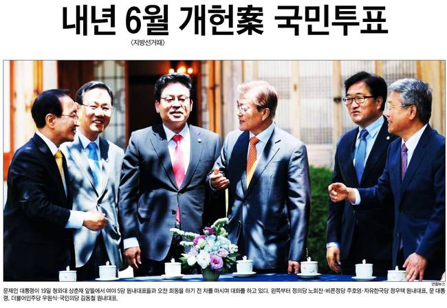 경향신문은 "문 대통령은 또 내년 6월 개헌 추진 입장을 재확인하며 “정치권의 개헌 논의 과정에 국민의 의견을 충실히 수렴해 반영하고 선거제도 개편도 함께 논의하는 것이 바람직하다는 의견을 제시했다”고 박 대변인이 전했다"며 "문 대통령은 “제 말을 지켜야겠다는 강박이 있다”는 말로, 개헌 추진 의지를 피력하기도 했다"고 보도했다.